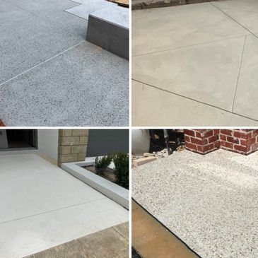 Exposed aggregate, coloured, plain, stamped concrete finishes. Wide range of colours.